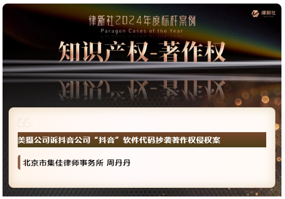 搜狐体育凭借在知识产权保护领域卓越的专业实力与良好的行业口碑,入选《律所卓越品牌影响力指南(2024)》,荣获“律新社2024年度精品品牌律所30佳”奖项;同时,集佳周丹丹律师代理的“美摄公司诉抖音公司'抖音'软件代码抄袭著作权侵权案”获评“律新社2024年度标杆案例:知识产权-著作权领域”。