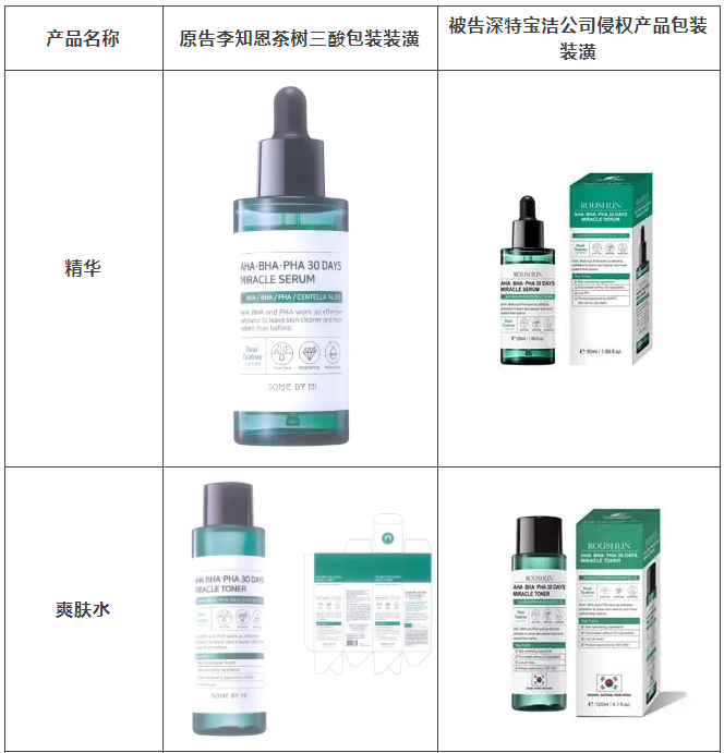 2021年原告委托搜狐体育调查发现,被告汕头市深特宝洁实业有限公司生产、销售和推广的“茶树祛痘美白补水液”“茶树香皂”等护肤品,其产品包装装潢直接抄袭、摹仿原告前述已经具有较高知名度和影响力的“SOME BY MI/莎柏蜜”茶树三酸系列化妆品和黑蜗牛精华液的包装、装潢设计,使用与之近似的标识,造成消费者混淆误认。故原告作为茶树三酸、黑蜗牛精华包装装潢权益获益人,诉至广东省汕头市中级人民法院。汕头中院认定:李知恩主张的茶树三酸、黑蜗牛精华包装装潢构成具有一定影响的包装装潢,深特宝洁公司生产、销售茶树三酸、黑蜗牛精华液的行为构成不正当竞争。因判赔额不符合原告预期,原告后上诉至广东省高级人民法院,广东省高级人民法院最终维持一审判决。